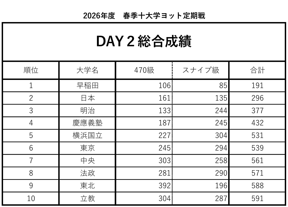 2026年3月28日から29日にかけて葉山沖で開催されました春季東京十大学戦の結果報告をさせて頂きます。